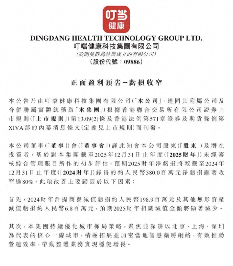 2月20日,叮当健康(09886)发布公告,预测2025财年净亏欠将显赫收窄逾80%,较2024财年约3.8亿元的净亏欠有显豁改善。